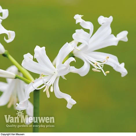 Nerine bowdenii ‘Alba’ are certain to bring a beautiful splash of colour to autumn beds and borders when other flowers are in short supply. The sharp white blooms of this Guernsey Lily are also perfectly suited for cutting and bringing indoors where their tall stems will show off the star-burst petals to full effect. Height: 45cm (18″). Spread: 8cm (3″).